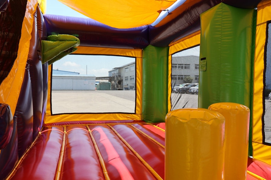 Features: Bounce area, inflated wall, inflated obstacles, stair climb, tall slide and basketball ring*.